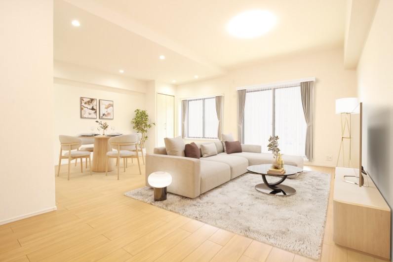 明るい色味で統一された室内空間。自然光が入り、さらに明るいお部屋に。窓を開ければ風が吹き、心地いい時間が流れます。(家具・雑貨はイメージです。)